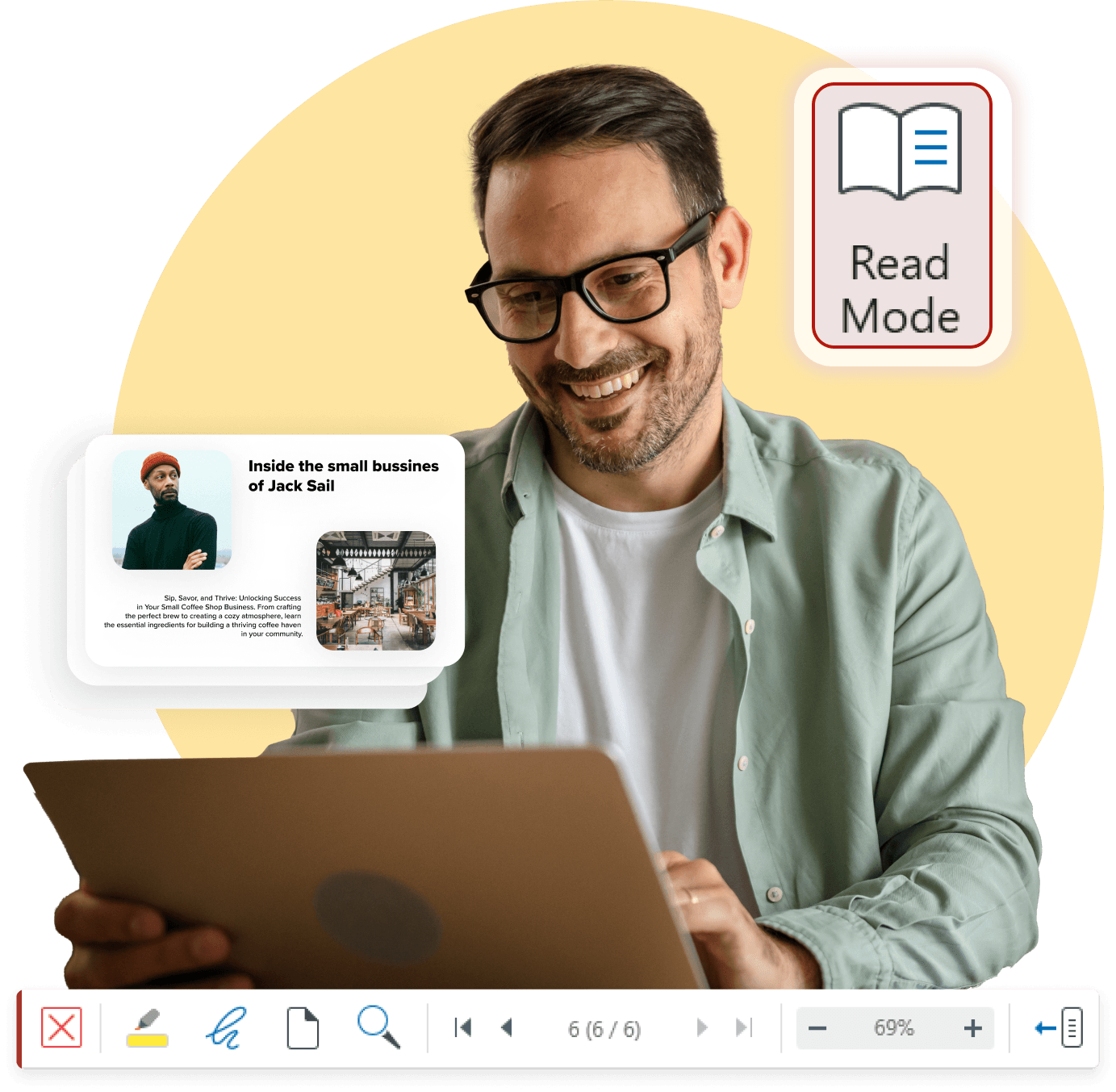 Focus on your content without unnecessary clutter. Leverage Read Mode’s streamlined interface to quickly flip through pages or navigate to specific PDF pages with a click. Seamlessly switch page view modes, highlight texts, zoom in and out, find specific words, or free draw all from a single toolbar that can be hidden away from view.
